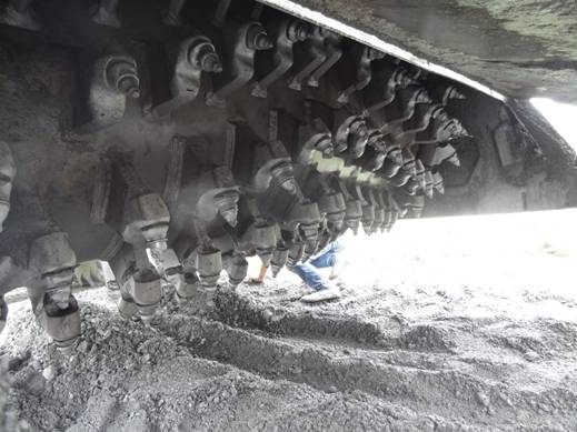 2014年6月,我公司冷再生機首次進入四川施工。先進入四川的是一臺600馬力WR2300L冷再生機,由河南隆裕工程公司于2011年向我公司購買,已工作了近四年,機器狀態(tài)仍然很好。冷再生工程為郫縣唐太路道路改造工程,主要路基的大修采用冷再生工藝。唐太路為水穩(wěn)路基結(jié)構(gòu),與華東等大部分地區(qū)不同的是路基下有大量的鵝卵石,這會對銑刨轉(zhuǎn)子造成很大的磨損,如果機器不是裝備了可折卸刀庫重型轉(zhuǎn)子,這個工程是不可能做下去的,刀具的損耗很大,齒套也有較大的磨損。施工隊伍在高經(jīng)理的帶領(lǐng)下,無論是施工速度還是施工質(zhì)量均獲得管理方的好評,打消了承包方最初對國產(chǎn)設(shè)備的疑慮。